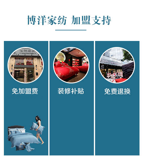 現(xiàn)在加盟博洋家紡享9大優(yōu)惠加盟支持!免費(fèi)獲取詳細(xì)加盟優(yōu)惠政策加盟條件、產(chǎn)品圖冊、投資詳情資料,敬請留言或電話垂詢。