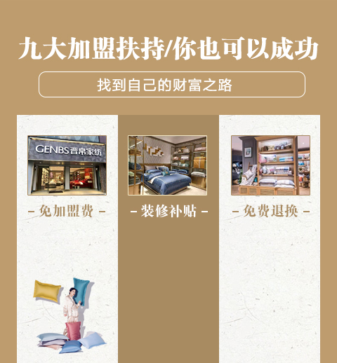 現(xiàn)在加盟晉帛家紡享9 大優(yōu)惠加盟支持!免費(fèi)獲取詳細(xì)加盟優(yōu)惠政策、加盟條件、產(chǎn)品圖冊(cè)、投資詳情資料,敬請(qǐng)留言或電話(huà)垂詢(xún)。