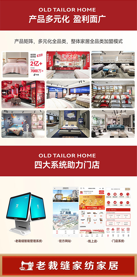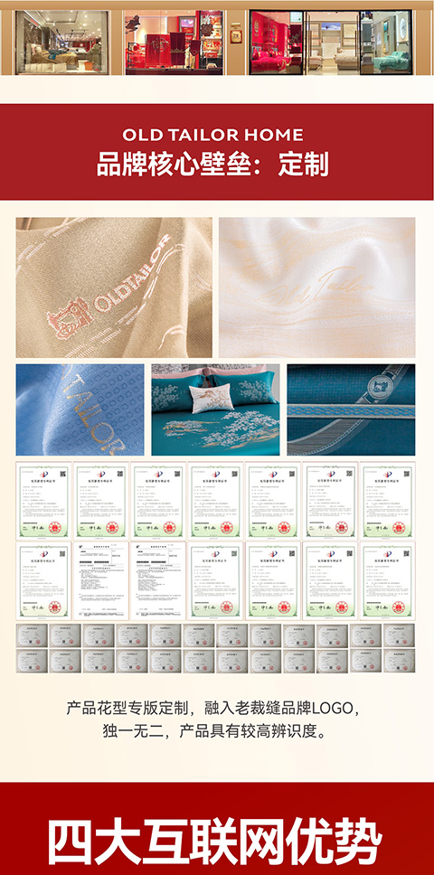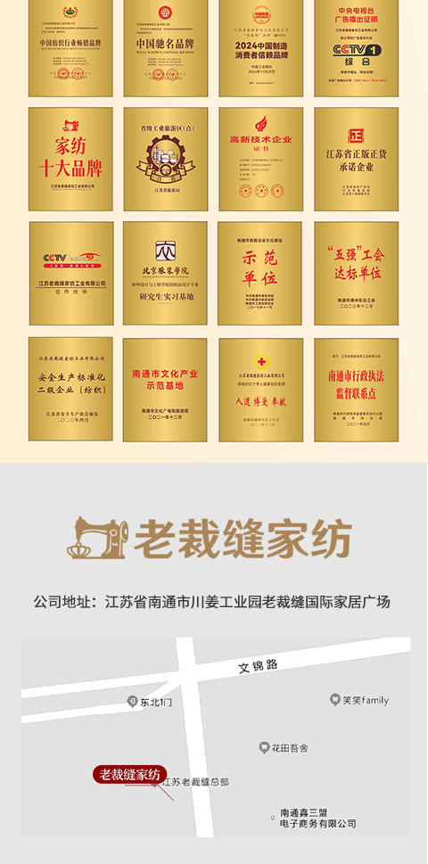 江蘇老裁縫家紡工業(yè)有限公司是一家集研發(fā)、生產(chǎn)、銷售、為一體實(shí)體運(yùn)營生產(chǎn)型的國家高新技術(shù)企業(yè),公司擁有10萬平方兩條航母式的生產(chǎn)工業(yè)園,老裁縫品牌產(chǎn)品涵蓋有家紡,家居,床墊,窗簾,整體軟裝家居廳臥軟裝一體化等系列上千個(gè)品類。公司一直注重企業(yè)創(chuàng)新管理,先后被評為國家高新技術(shù)企業(yè),江蘇省工業(yè)旅游示范企業(yè),南通市文化示范基地,央視《發(fā)現(xiàn)誠信》欄目和《對話中國品牌》欄目組也紛紛走進(jìn)老裁縫,達(dá)成戰(zhàn)略合作。企業(yè)也是北京服裝學(xué)院研究生實(shí)習(xí)基地,產(chǎn)品先后獲得張謇杯潮流風(fēng)尚獎(jiǎng)及省文創(chuàng)大賽等設(shè)計(jì)大獎(jiǎng)。