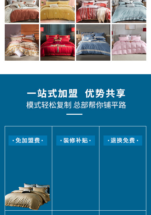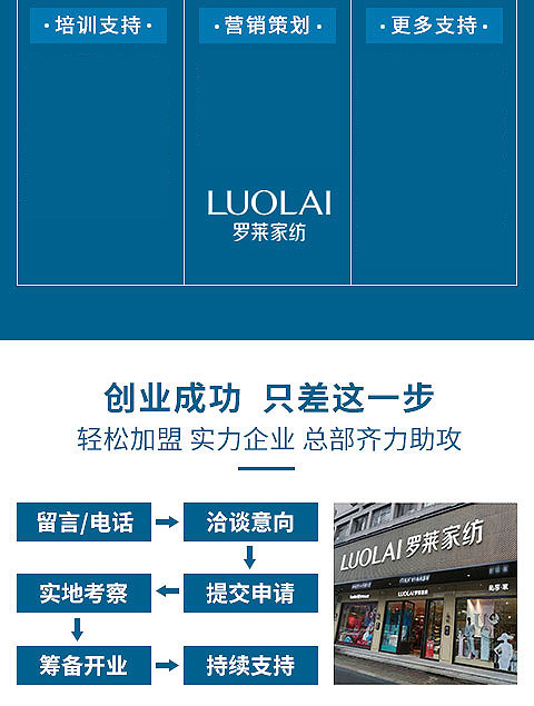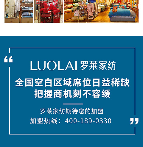 現(xiàn)在加盟羅萊家紡享9大優(yōu)惠加盟支持!免費獲取詳細(xì)加盟優(yōu)惠政策、加盟條件、產(chǎn)品圖冊、投資詳情資料,敬請留言或電話垂詢。