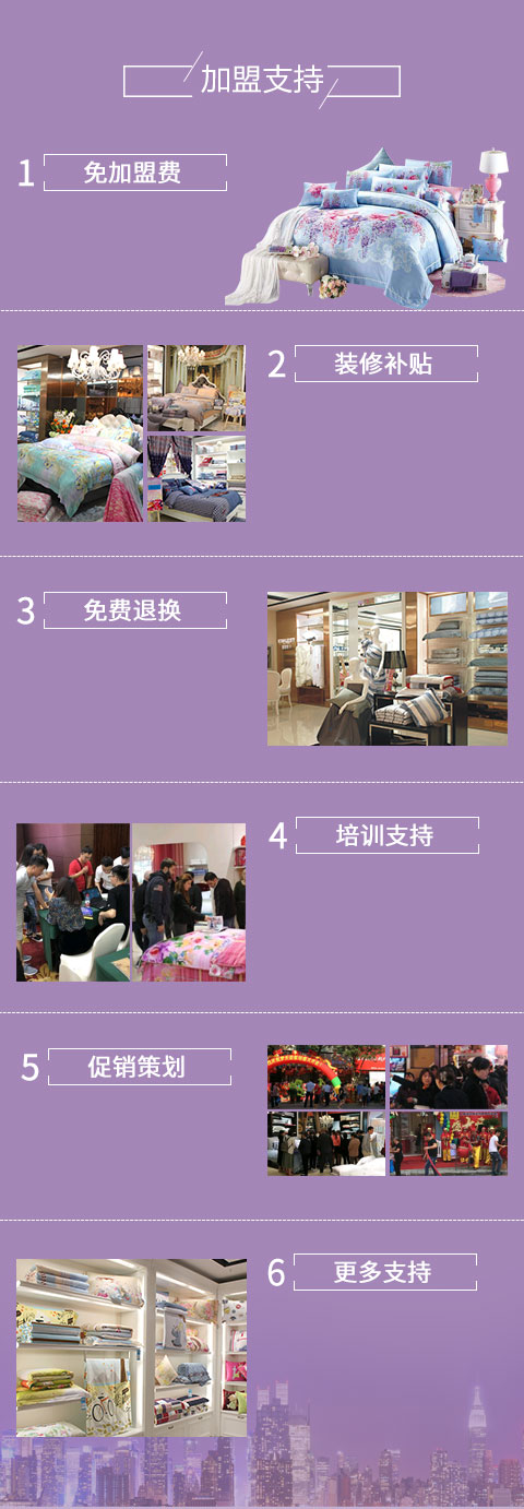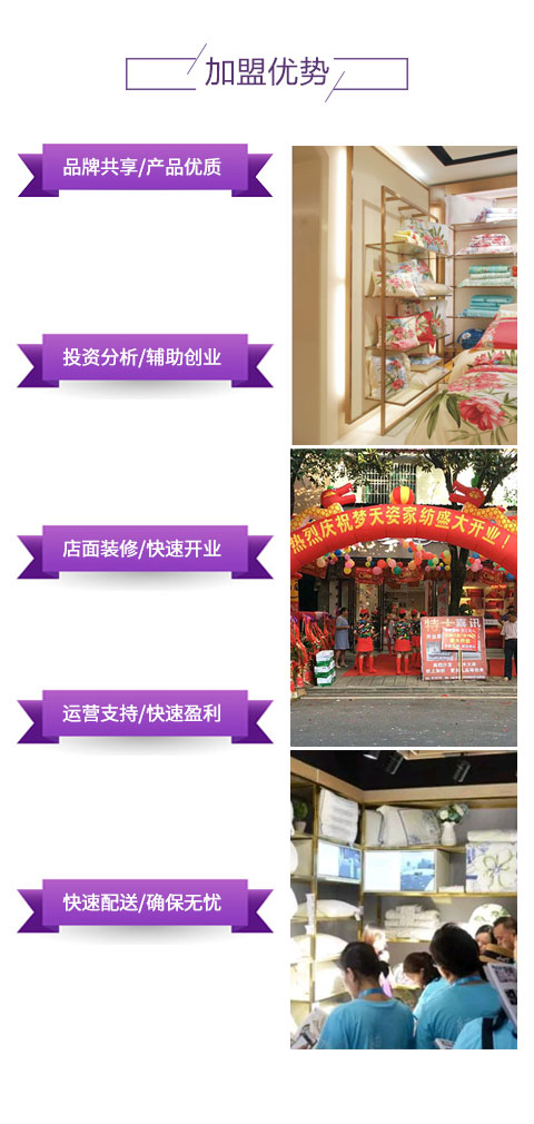現(xiàn)在加盟夢(mèng)天姿家紡享9大優(yōu)惠加盟支持!免費(fèi)獲取詳細(xì)加盟優(yōu)惠政策、加盟條件、產(chǎn)品圖冊(cè)、投資詳情資料,敬請(qǐng)留言或電話垂詢。