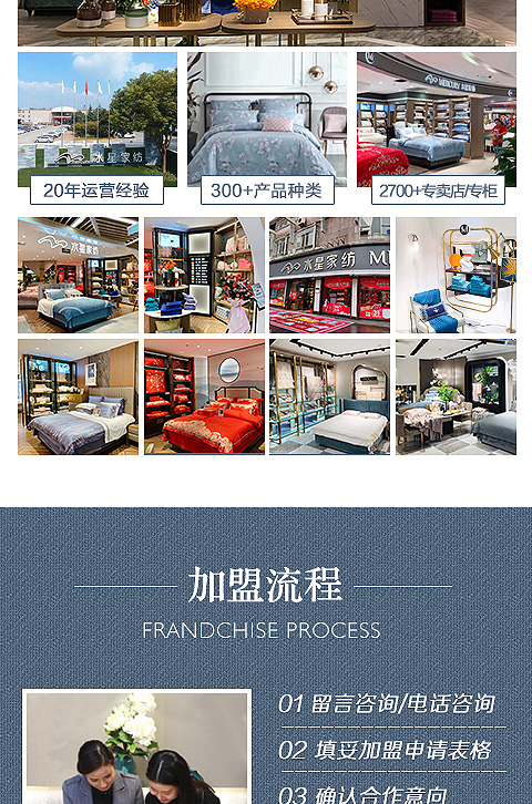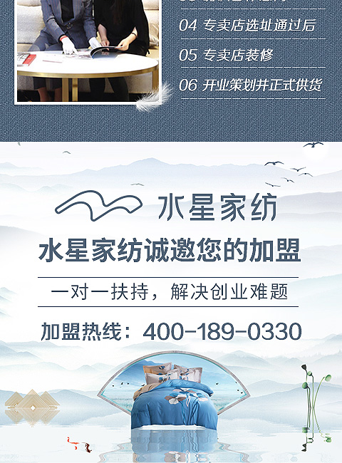 現(xiàn)在加盟水星家紡享9大優(yōu)惠加盟支持!免費(fèi)獲取詳細(xì)加盟優(yōu)惠政策、加盟條件、產(chǎn)品圖冊、投資詳情資料,敬請留言或電話垂詢。